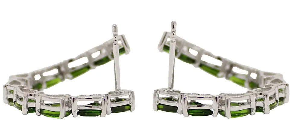 Sterling silver green gemstone post earrings. The earrings are off-plane loops on posts. They lie flat to the ear and loop around to the back. They have an outside diameter of 1 inch.