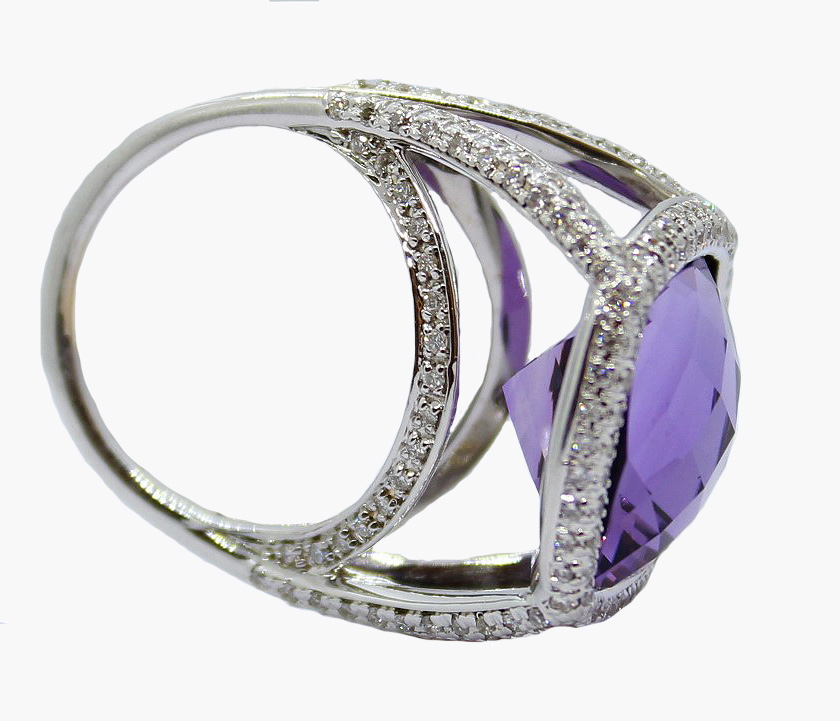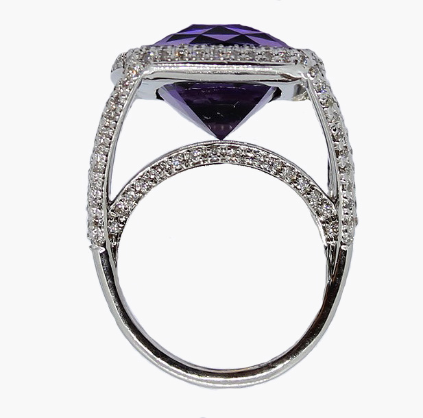 This beautiful ring is set in 18kt white gold with round diamonds totaling 1.1cttw. The diamonds are surrounding a beautiful deep purple antique cushion cut Amethyst.