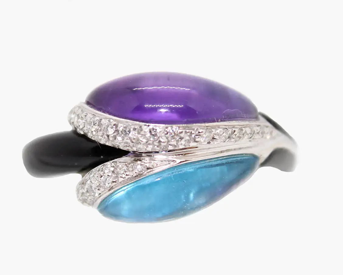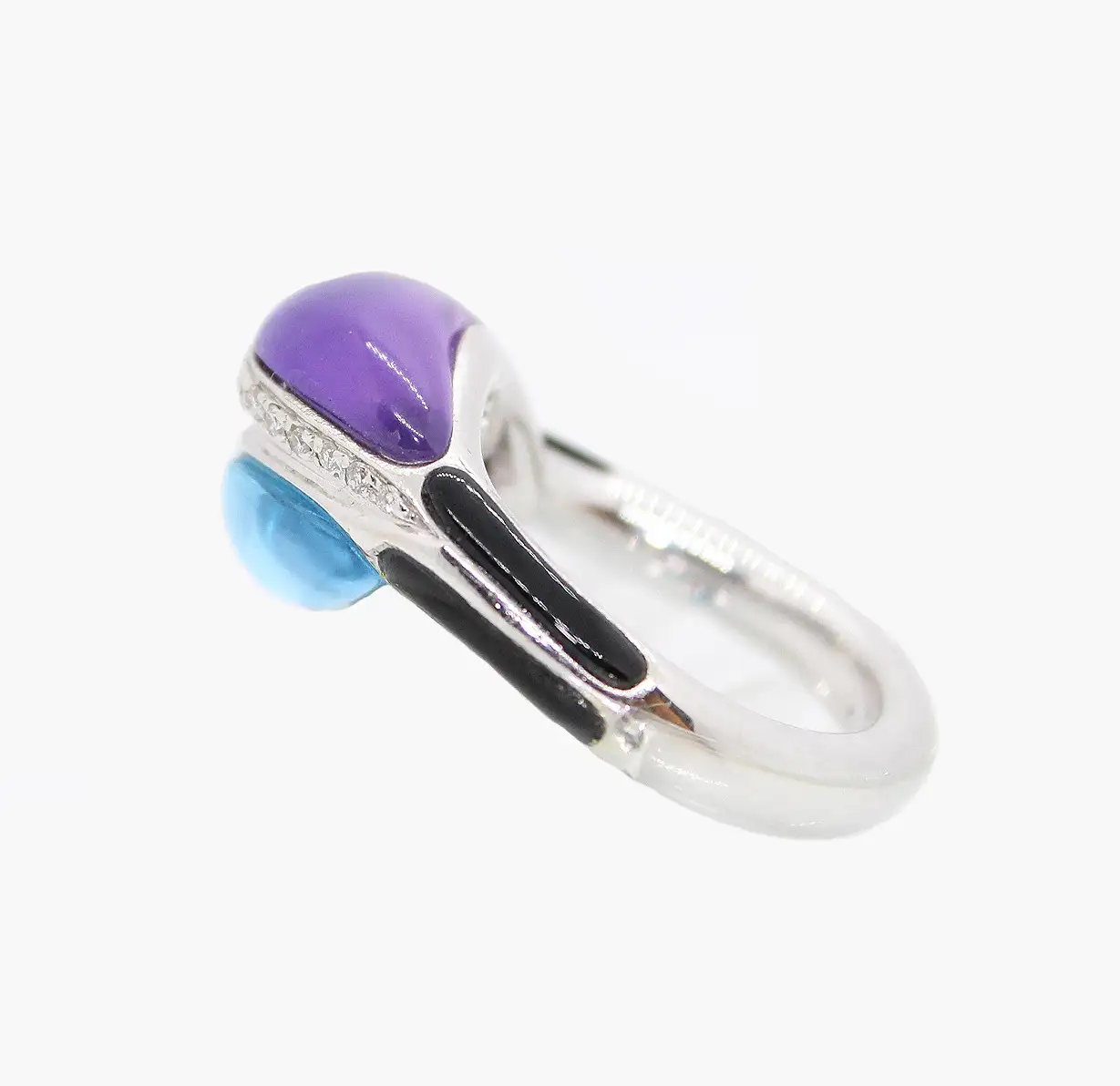 This beautiful ring is set in 18kt white gold with a blue Topaz and Amethyst. Diamond Accents and Black enamel.