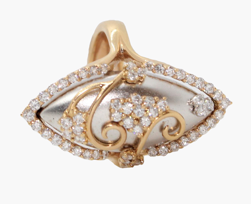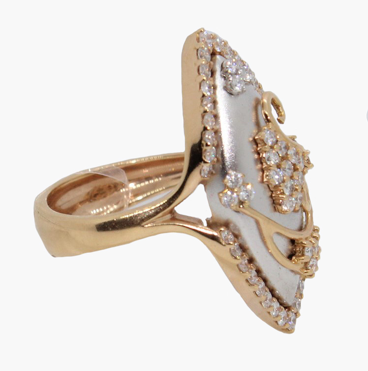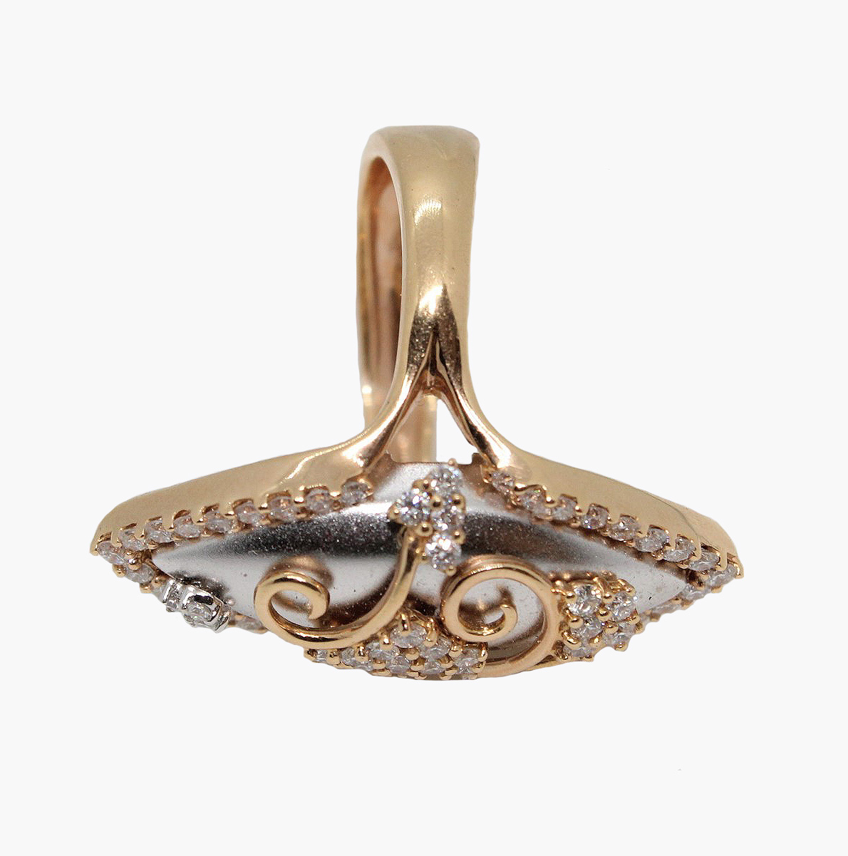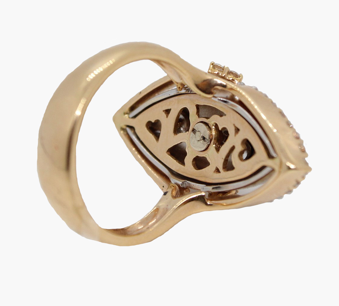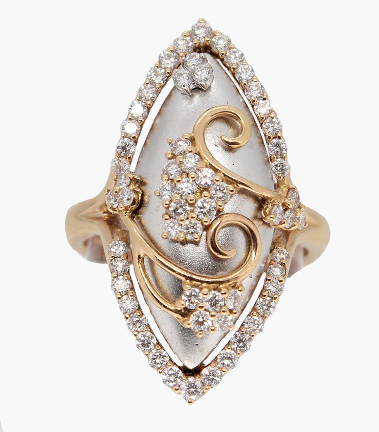 This beautiful ring is set in 18kt white and yellow gold with round diamonds totaling .92cttw.