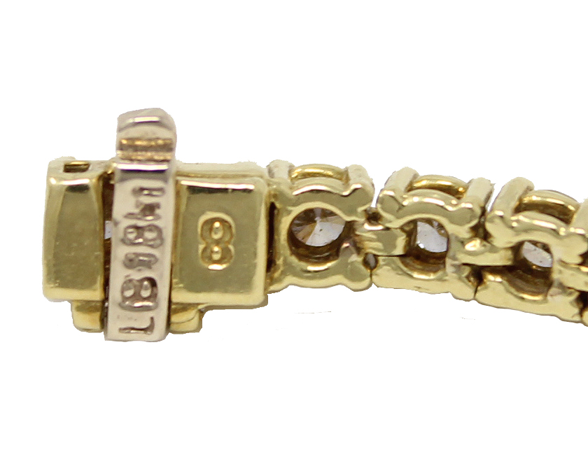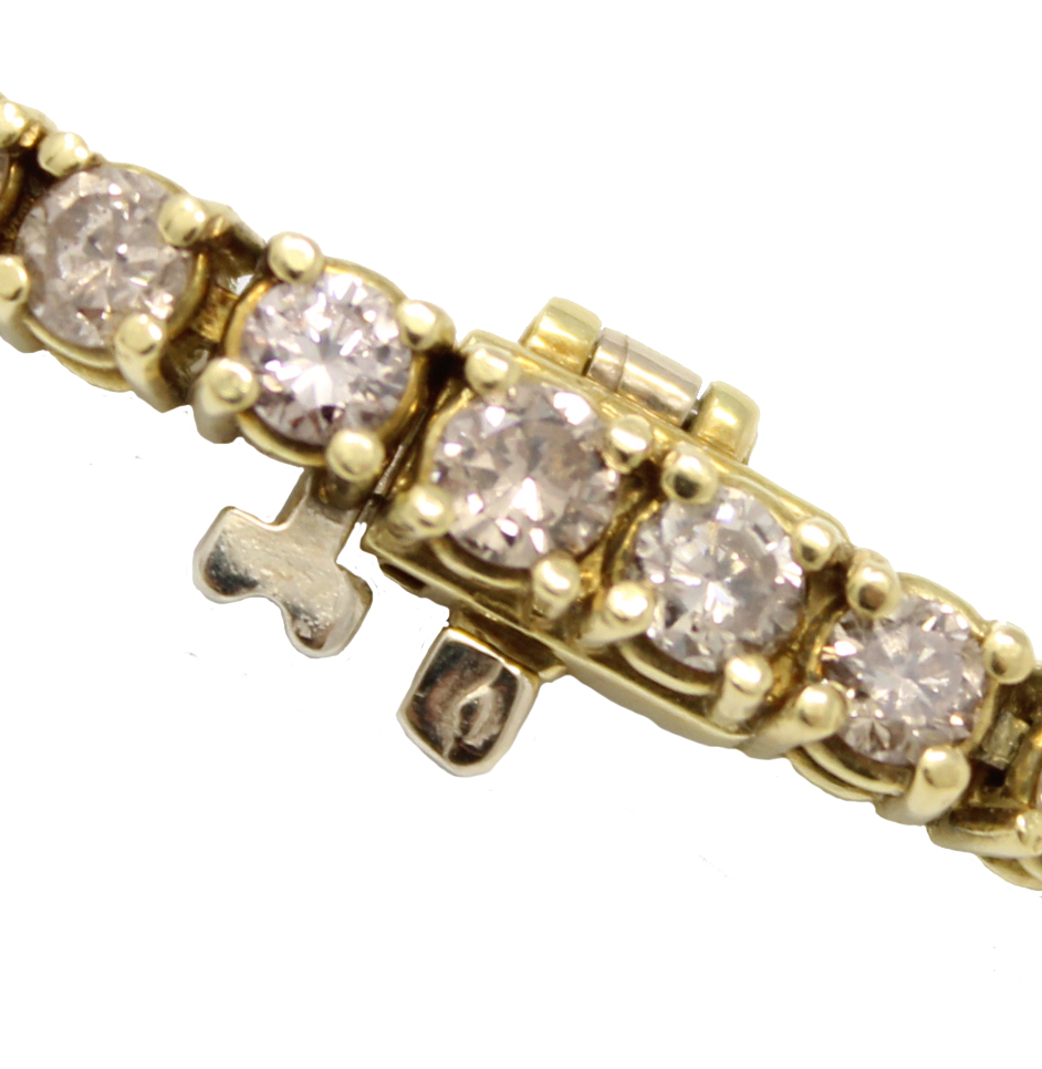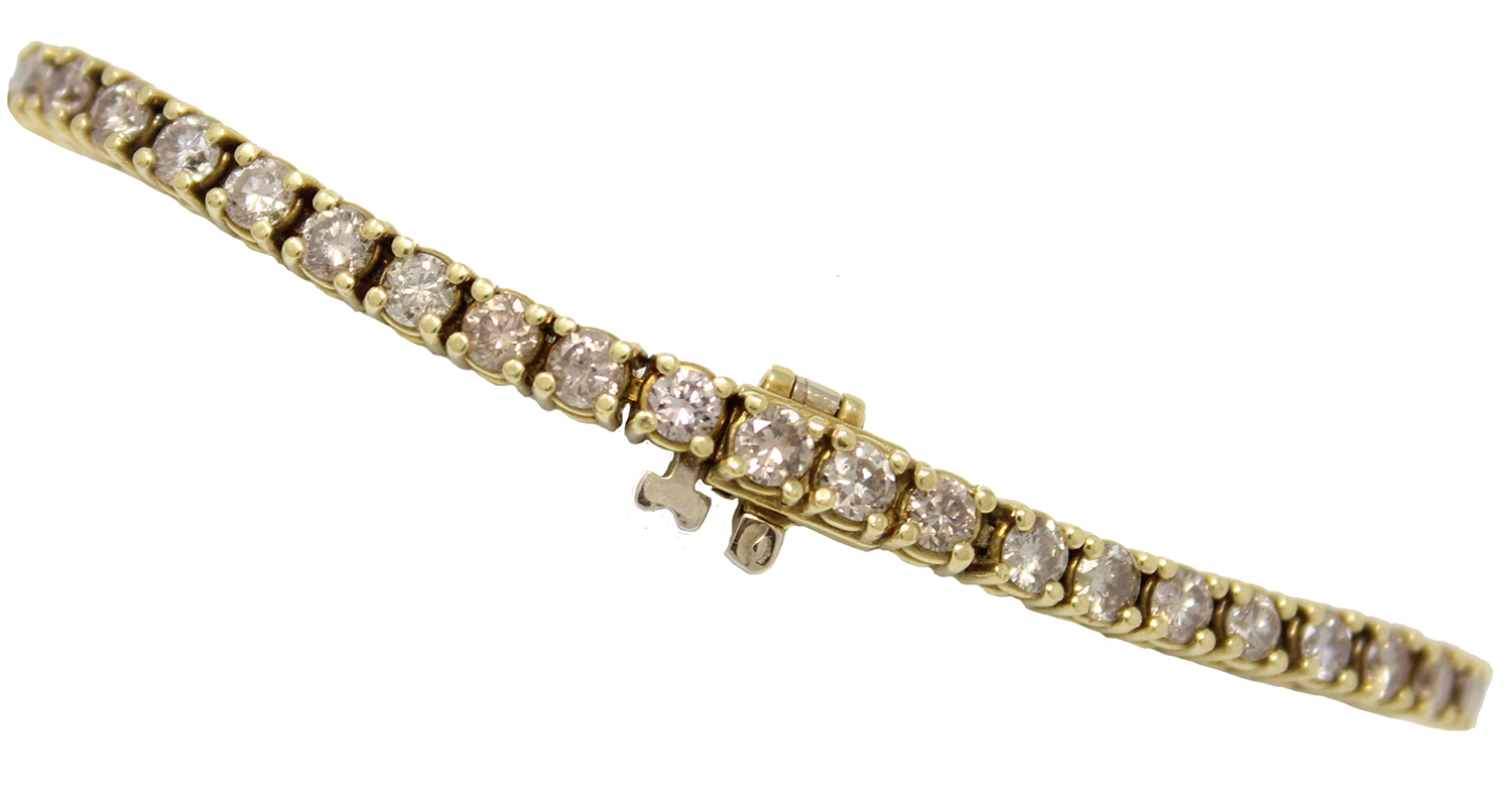 18K yellow gold champagne-colored diamond tennis bracelet. Bracelet has 51 champagne-colored diamonds for a total weight of 5cttw. Bracelet is 7-1/4 inches long.