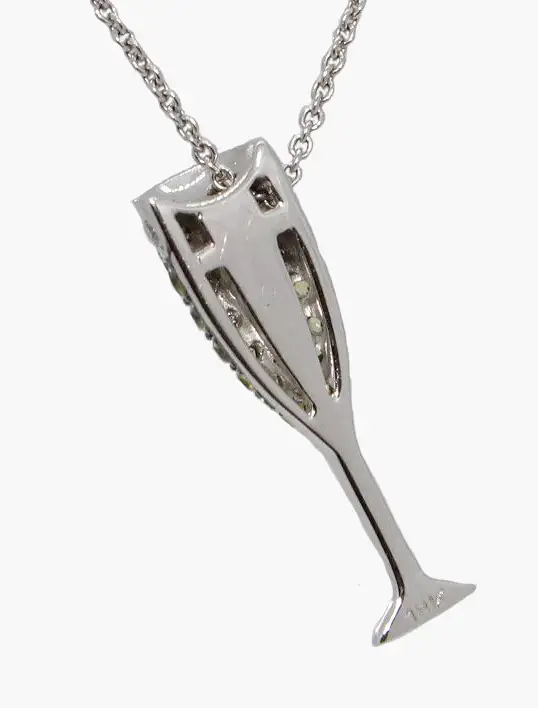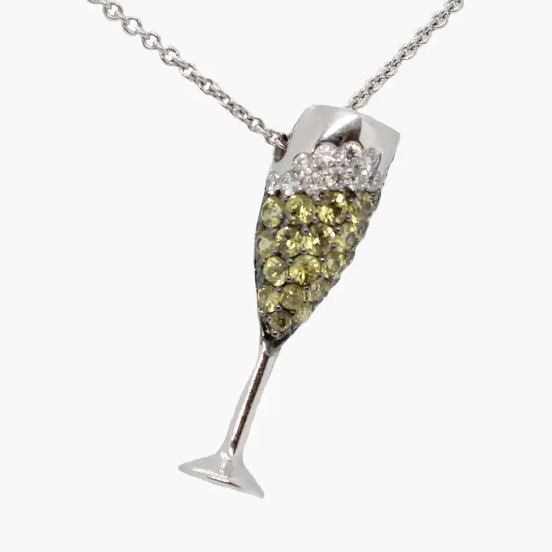 18K White gold Champagne glass pendant with 12 round diamonds totaling .07cttw and round yellow sapphires totaling .35cttw. Champagne glass pendant is 3/4 long. Chain is 17 inches long with an O ring at 16 inches, allowing chain to be worn shorter.
