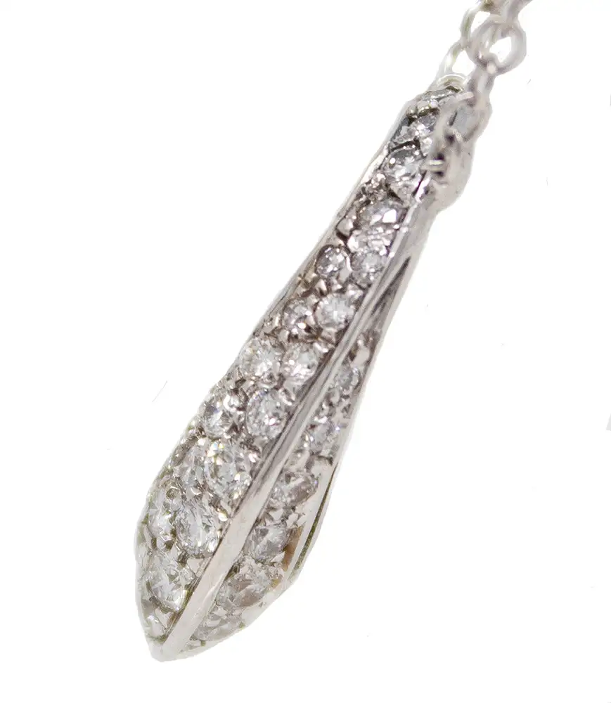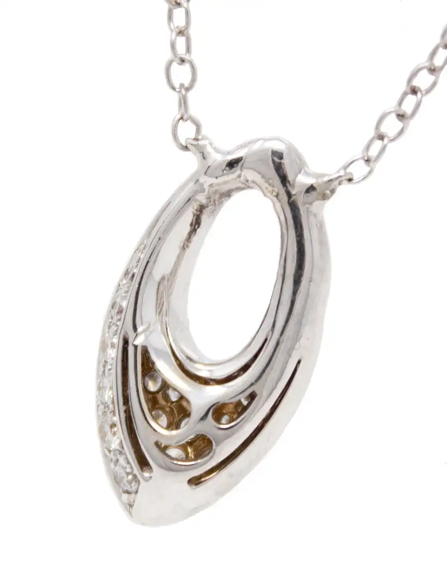 18K white gold diamond cluster almond-shaped necklace with an almond-shaped cutout offset near the top. The diamond cluster is 3/8 inch long by 1/2 inch wide. The individually set diamonds have a total weight of .5cttw. There is 8 inches of chain attached to each side of the pendant for a total chain length of 16 inches.
