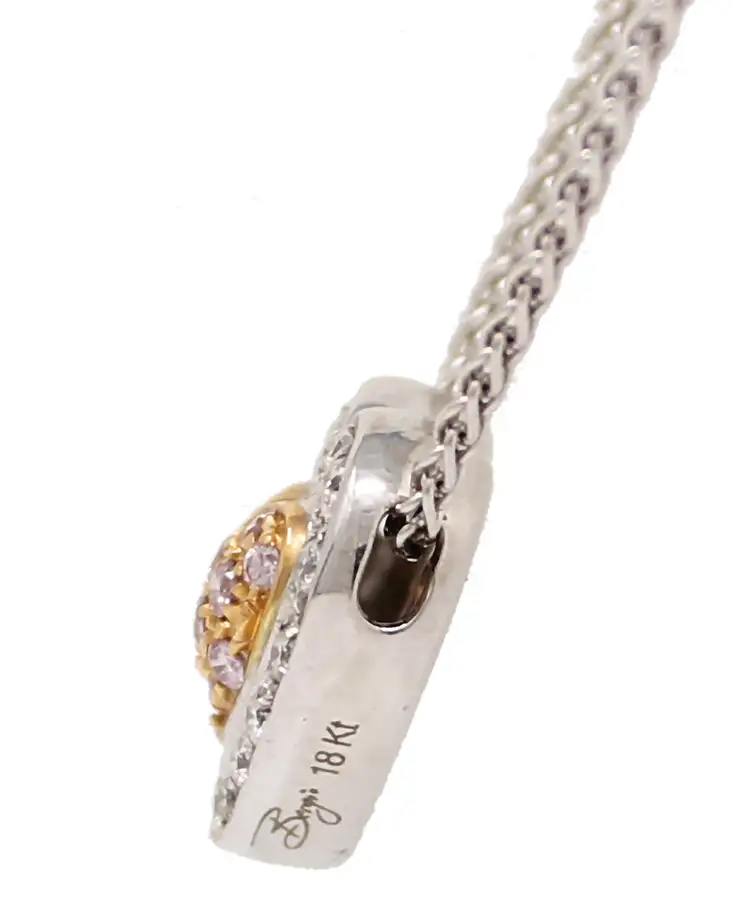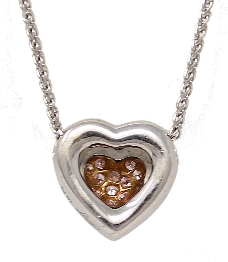 18K white and yellow gold diamond heart pendant necklace. 16 round diamonds weighing 0.22cttw surround 11 round pink diamonds weighing 0.15cttw. The hollow heart pendant is approximately 1/2 inch high by 1/2 inch wide. A 17-inch chain threads through holes in the side of the heart.