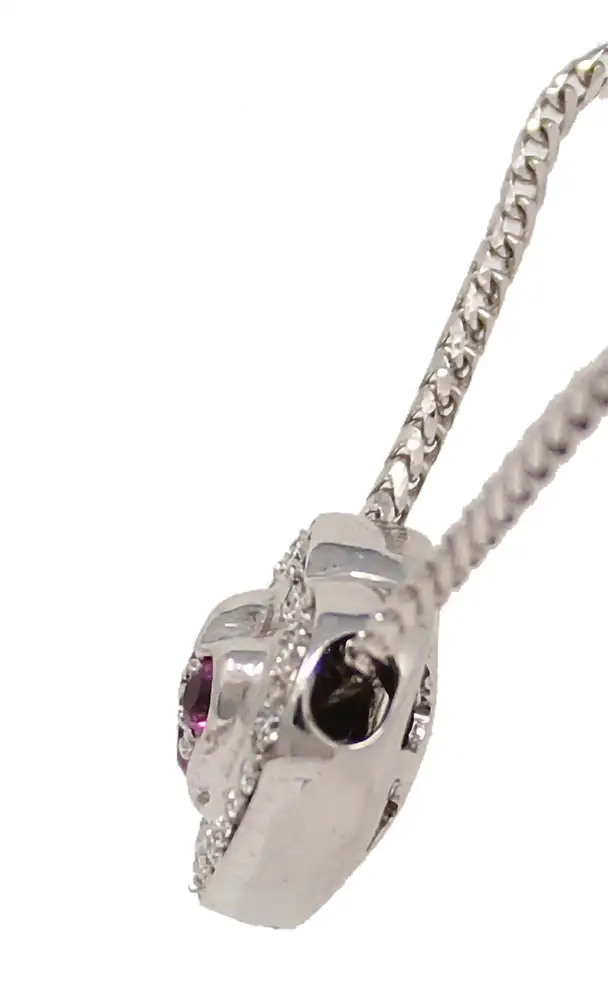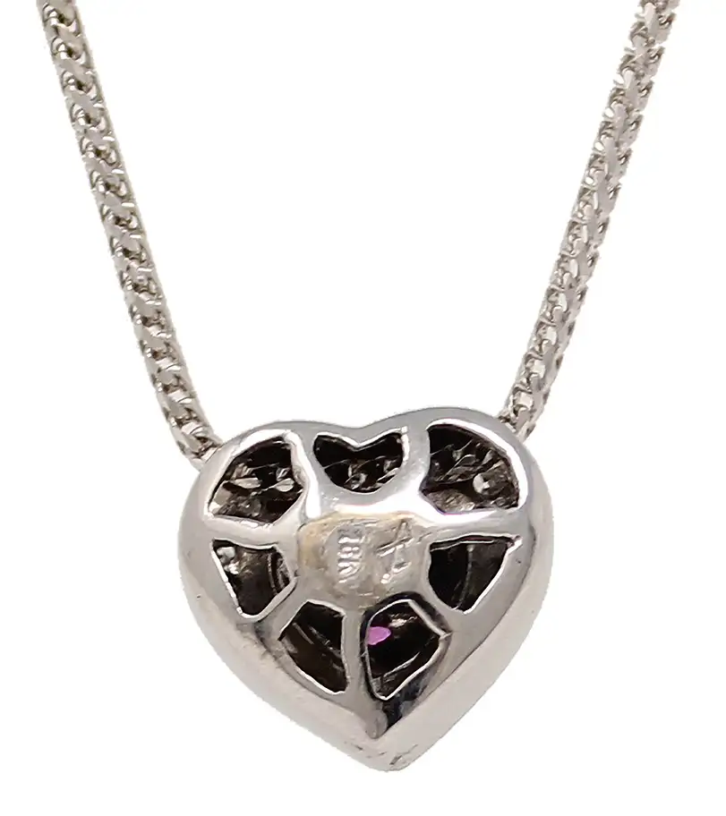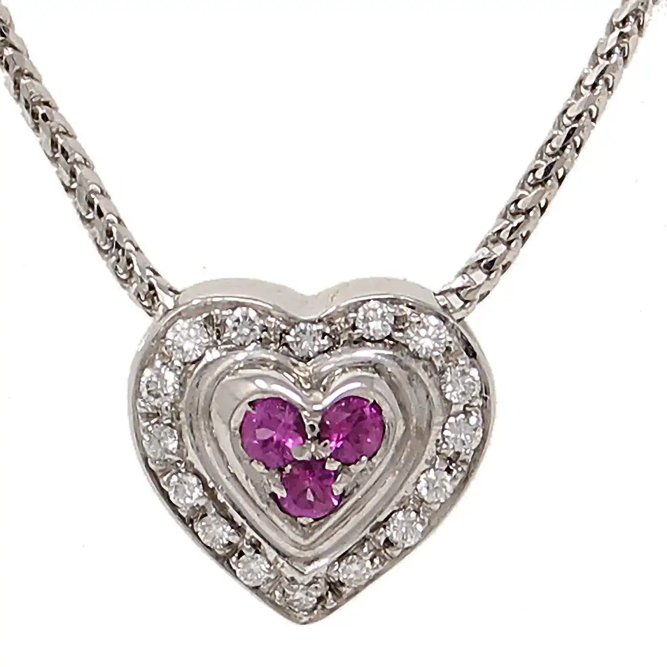18K white gold diamonds and pink sapphires heart-shaped pendant necklace. 16 round diamonds weighing 0.25cttw surround three round pink sapphires weighing 0.16cttw. The hollow heart pendant is approximately 1/2 inch high by 1/2 inch wide. A 17-inch chain threads through holes in the side of the heart.