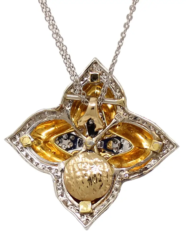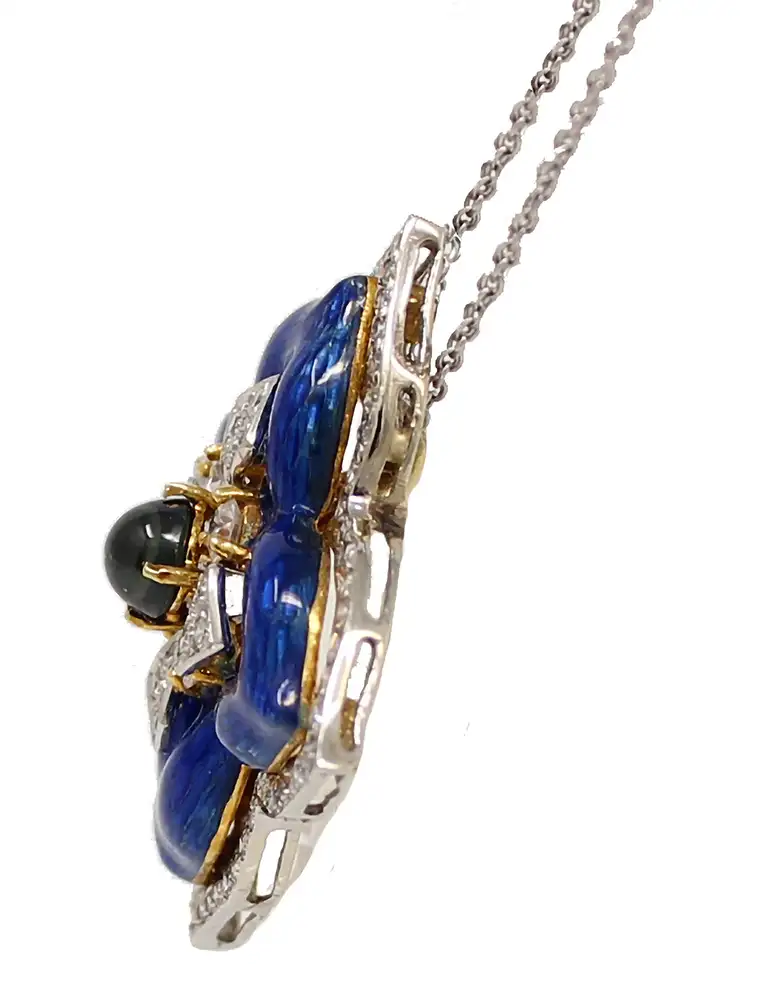 18K white and yellow gold enamel flower pendant necklace. The pendant has 87 round diamonds weighing 1.15cttw. The center cabochon sapphire weighs 0.5cttw. The pendant is 1 inch wide by 1 inch high. It hangs diagonally from a double 18-inch chain looped through the back of the pendant.