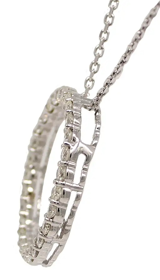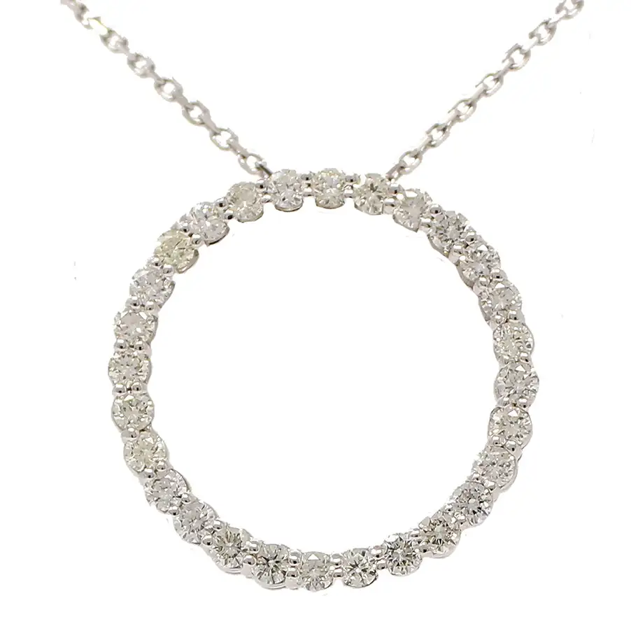 14K white gold circle of round diamonds pendant necklace. Total weight of the individually set round diamonds is 1.55cttw. 18-inch chain loops through the top of the pendant.
