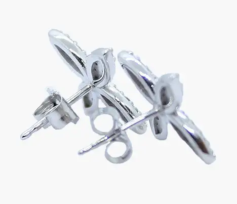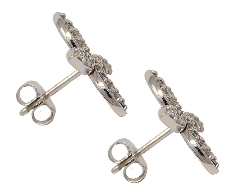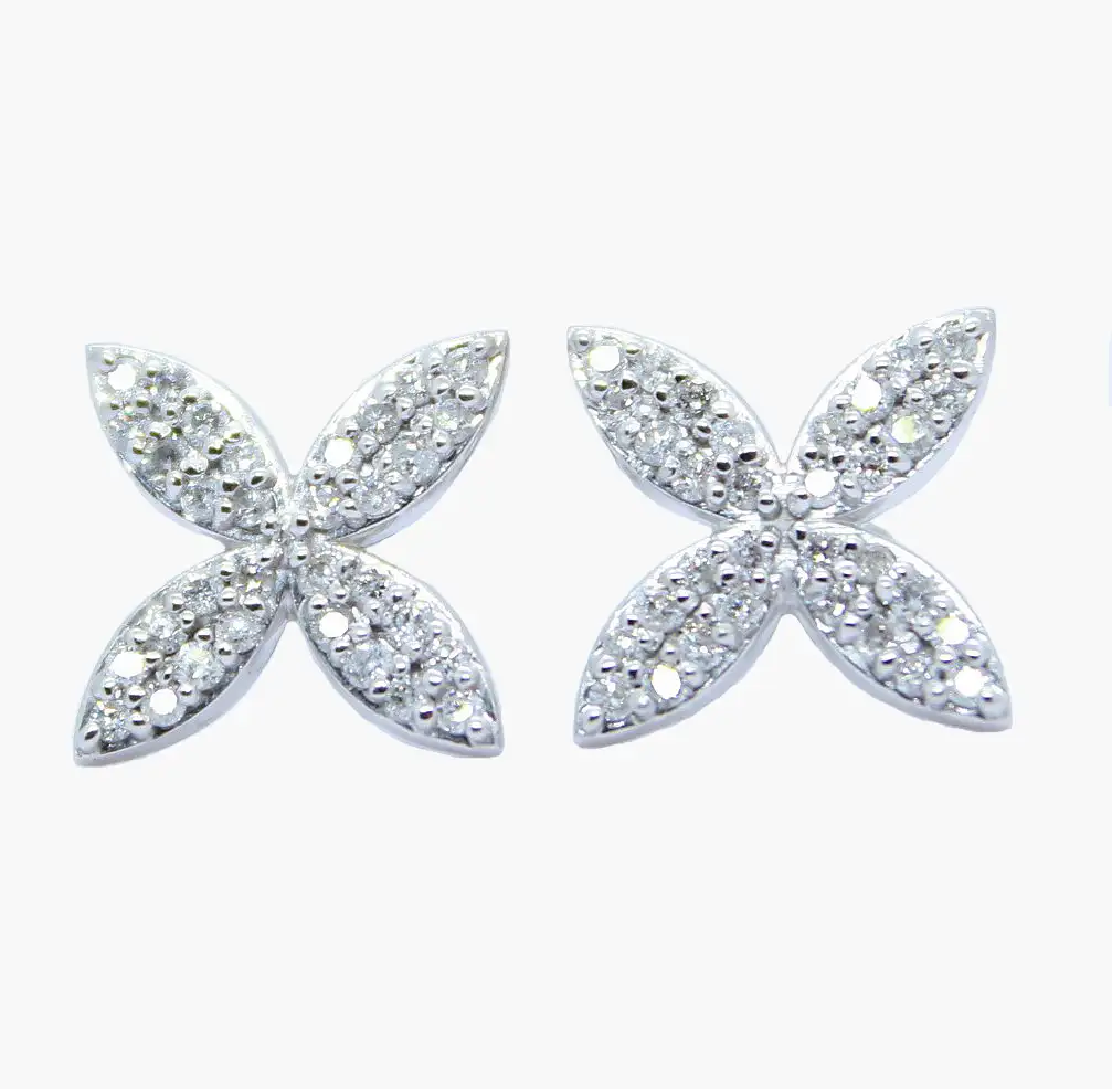 14K white gold diamond four-petal post earrings. Earring diameter is approximately 5/8 inch. Individually set round diamonds weigh 0.82cttw.