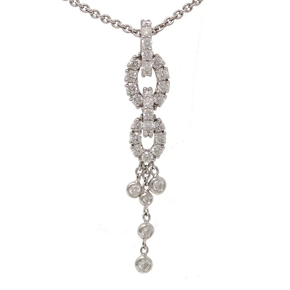 18K white gold diamond dangling links pendant necklace. Individually set round diamonds weigh 0.84cttw. Pendant is 1-1/2 inches long. It hangs from a 17-inch chain with an o ring at 16 inches, allowing the necklace to be worn shorter.