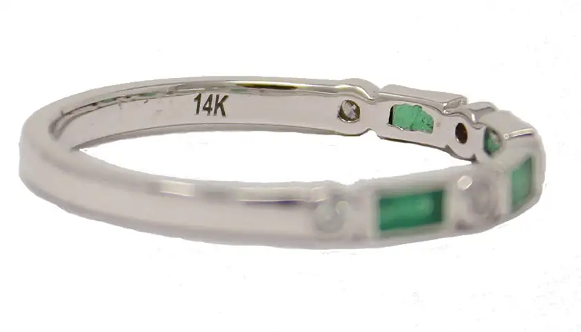 14K white gold emerald and diamond ring. Four step cut emeralds are bezel set and weigh .29cttw. Five round diamonds are bezel set and weigh .07cttw. Ring size is 6.5. Ring can be re-sized.
