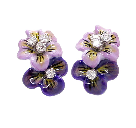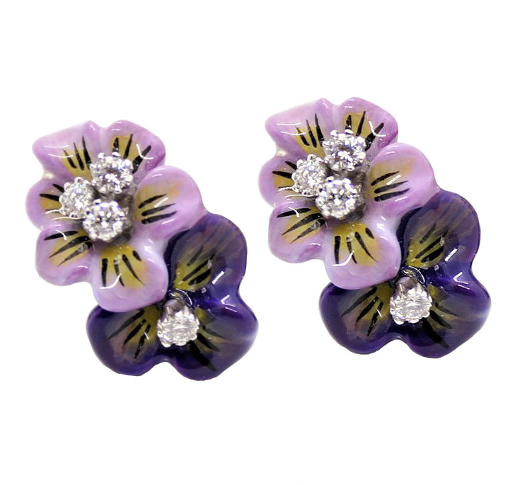 18K Hand painted enamel double flower earring . 8 diamonds for a 0.17cttw. Earrings measures 5/8 inches long and 3/8 inches wide.  Each pieces hand painted in Italy.