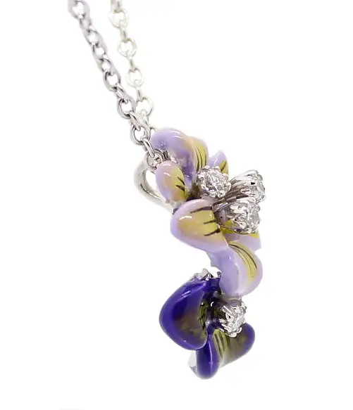 18K Italian hand painted enamel double flower pendant with four diamonds weighing .08cttw. Pendant measures 5/8 inches long and 3/8 inches long. Chain measures 16 inches long.