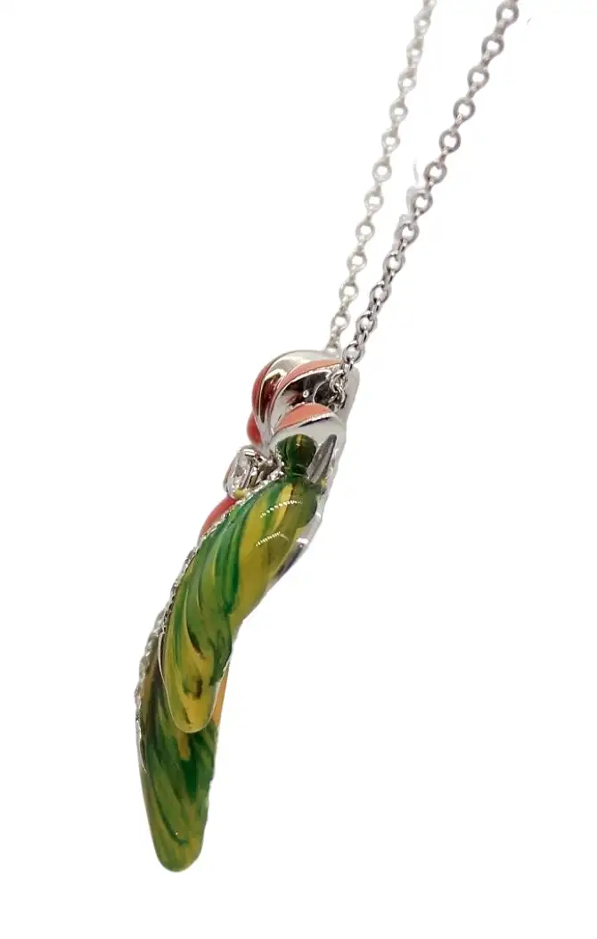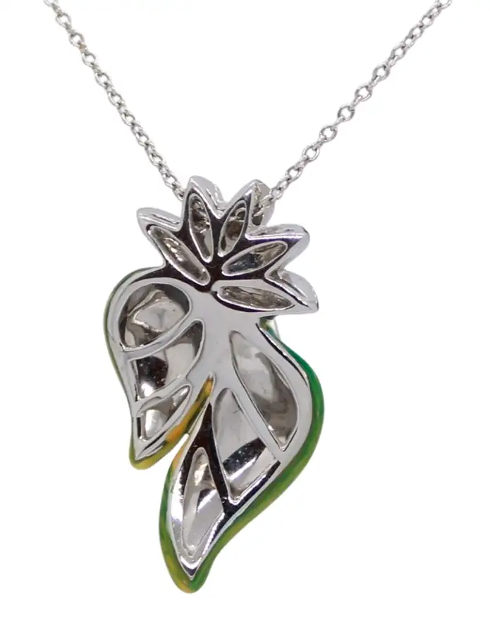 18K Italian hand painted enamel orange tropical flower with diamonds. The round diamonds weigh 0.18cttw. Pendant measures 1-1/4 inches long and 3/4 inches wide. Chain measures 16 inches long.