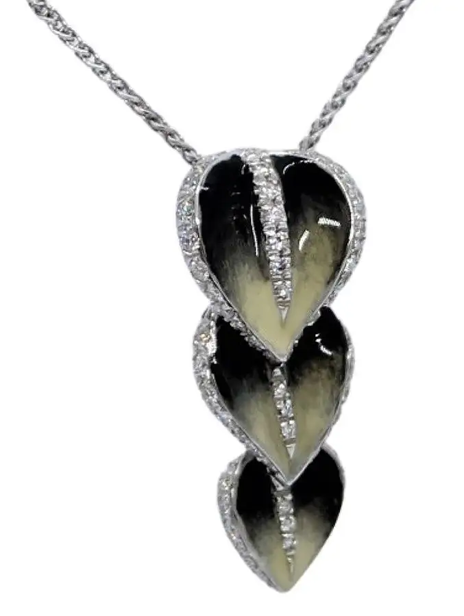 18K Hand painted enamel flower pendant. .46 cttw of round diamonds. Pendant measures 1 1/8 inches long and 1/2 inches wide. The wheat Chain measures 16 inches long. Each piece is hand painted in Italy.