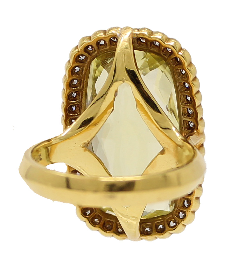 18K yellow gold green quartz and diamond ring. The center elongated antique cushion cut green quartz is 22mm high by 14mm wide. It is surrounded by a halo of round diamonds weighing 0.50cttw. Ring size is 6-1/2. Ring can be resized.
