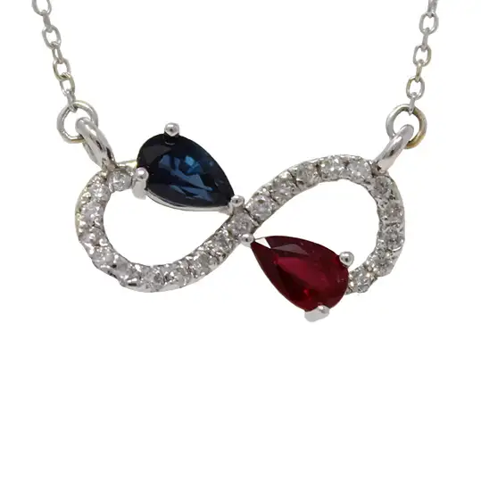 14K white gold pear blue sapphire, pear ruby, and round diamonds infinity-shaped necklace. The infinity is 1/2 inch wide. The pear blue sapphire is .37ct. The pear ruby is .33ct. Individually set round diamonds total .14cttw. The chain is 18 inches long, with 9 inches on each side of the infinity.