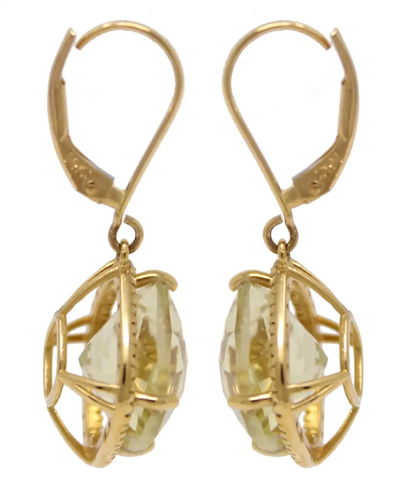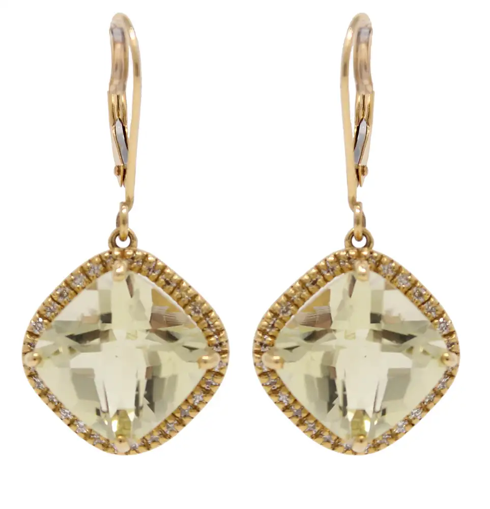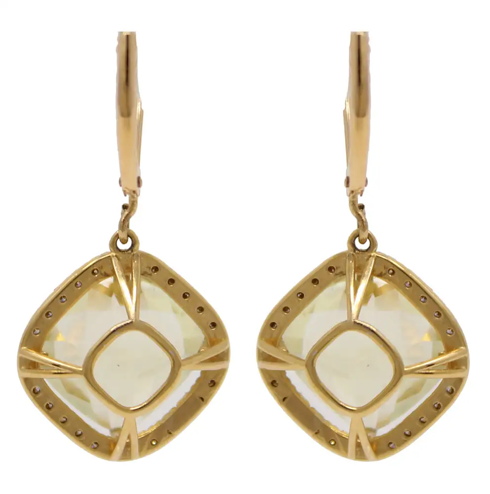 14K yellow gold cushion cut lemon amethyst earrings with lever backs. Each amethyst is 11.5mm and is mounted on a diamond-accented basket that forms a halo around the stone. The total weight of the two amethysts is 11.28cttw.