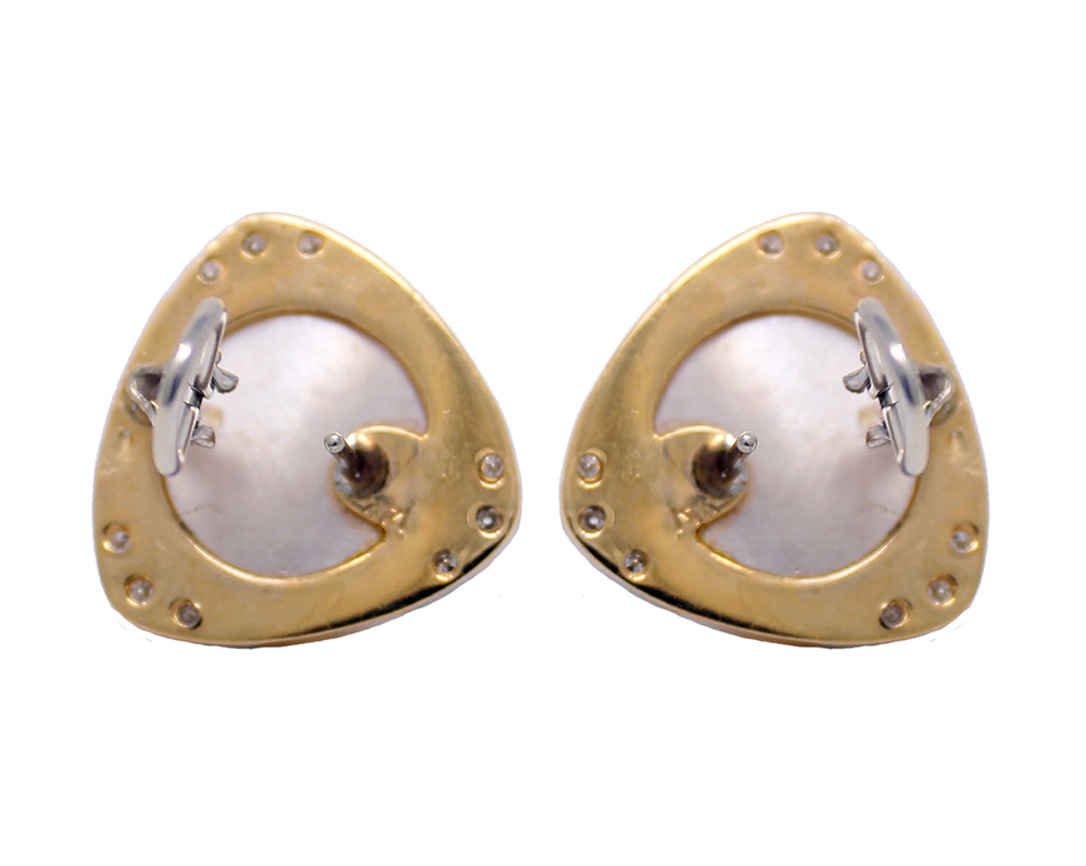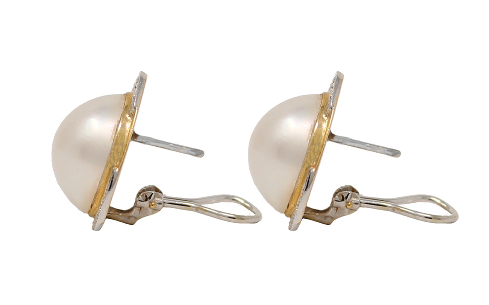 14K white and yellow gold mabe pearl and diamond post omega clasp earrings. Each mabe pearl is 16mm. There are 9 round diamonds in each earring for a total of 18 diamonds weighing .25cttw.