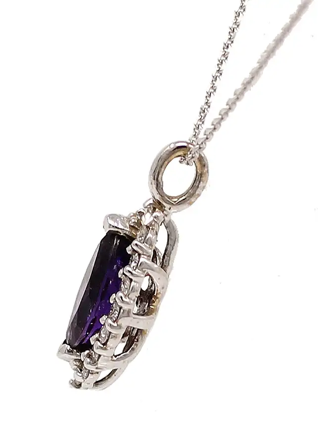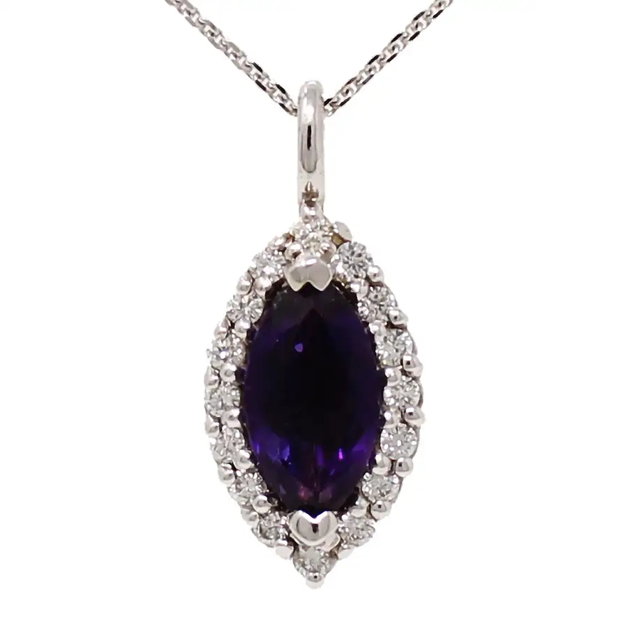 14K white gold marquise amethyst and diamond pendant necklace. The marquise amethyst is 5mm wide by 10mm high. The halo of round diamonds surrounding the amethyst weigh 0.30cttw. The chain is 18 inches long.