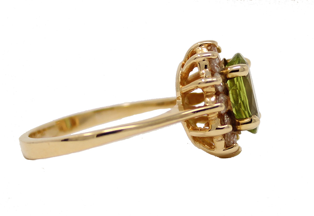 14K yellow gold oval peridot and diamond ring. The center peridot measures 9mm high by 7mm wide. It is surrounded by a halo of round H/VS2 diamonds weighing 0.48cttw. Ring size is 6-1/4. Ring can be resized.