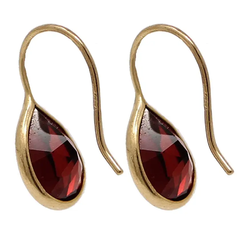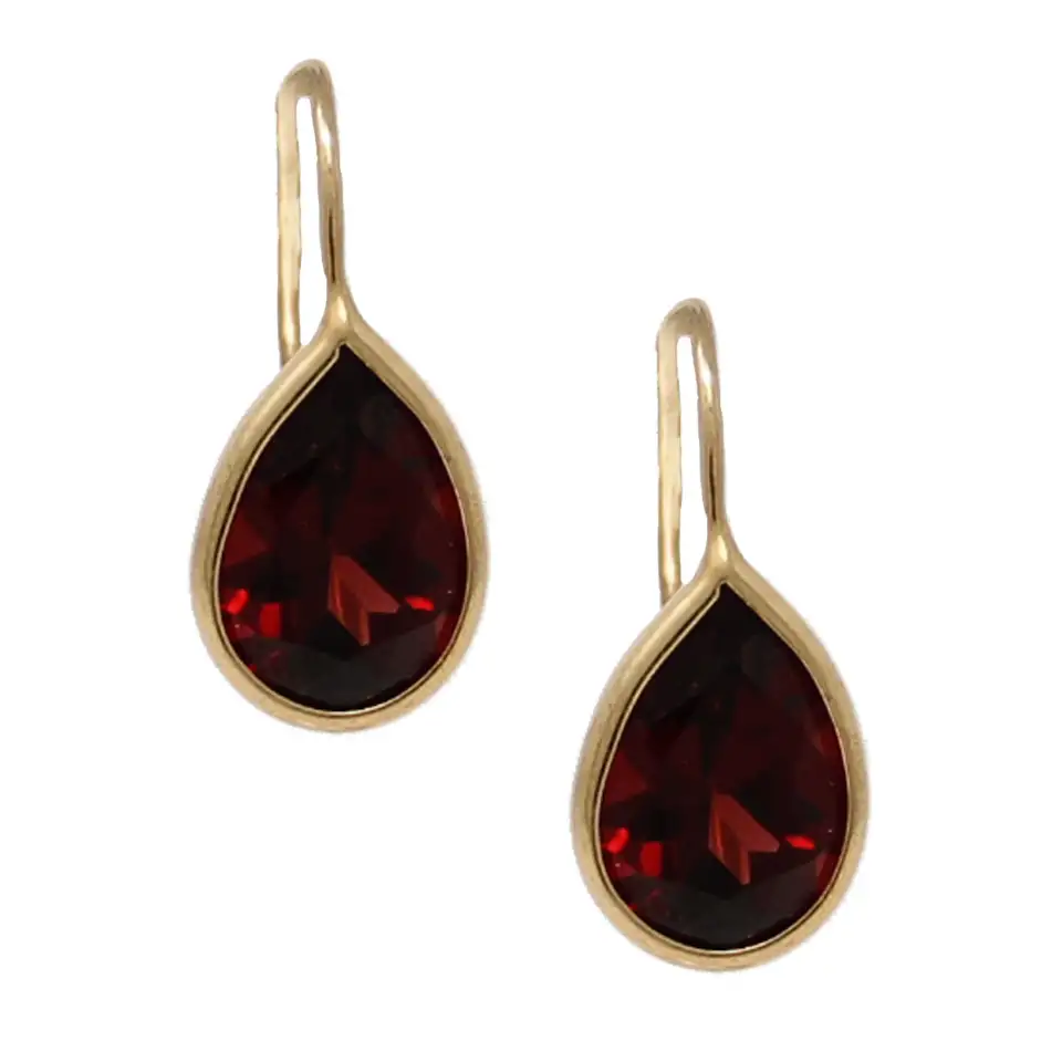 14K yellow gold bezel-set pear-shaped red garnet fishhook earrings. Earrings are 3/4-inch long from the top of the fishhook to the bottom of the pear.