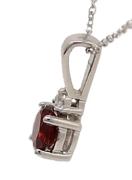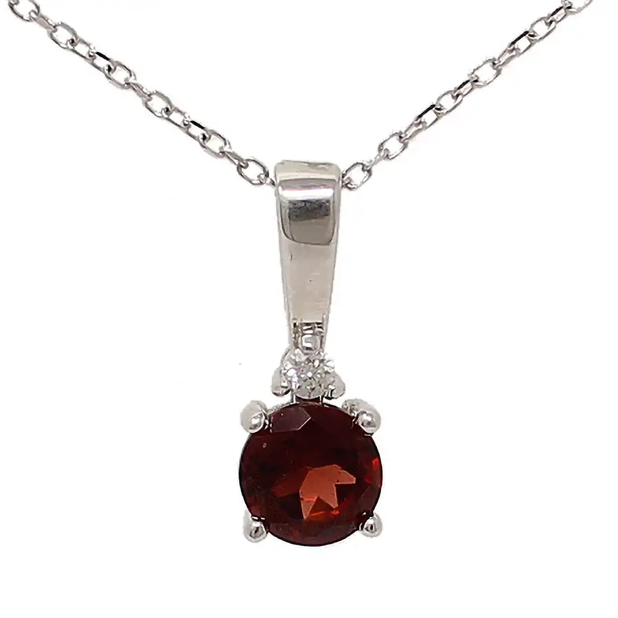 14K white gold round red garnet pendant necklace with a tiny diamond accent where the bail meets the garnet. The red garnet is 0.5cttw; the diamond is 0.03cttw. The chain is 18 inches long.