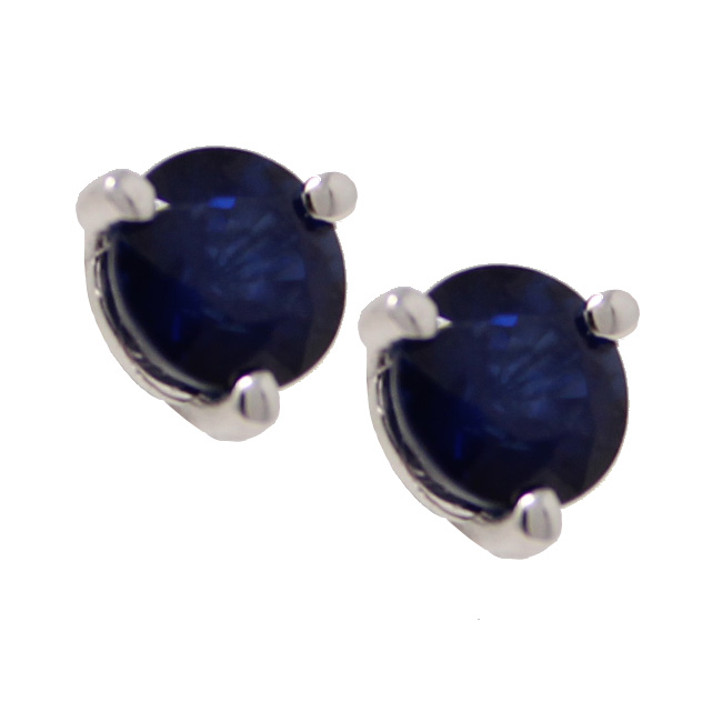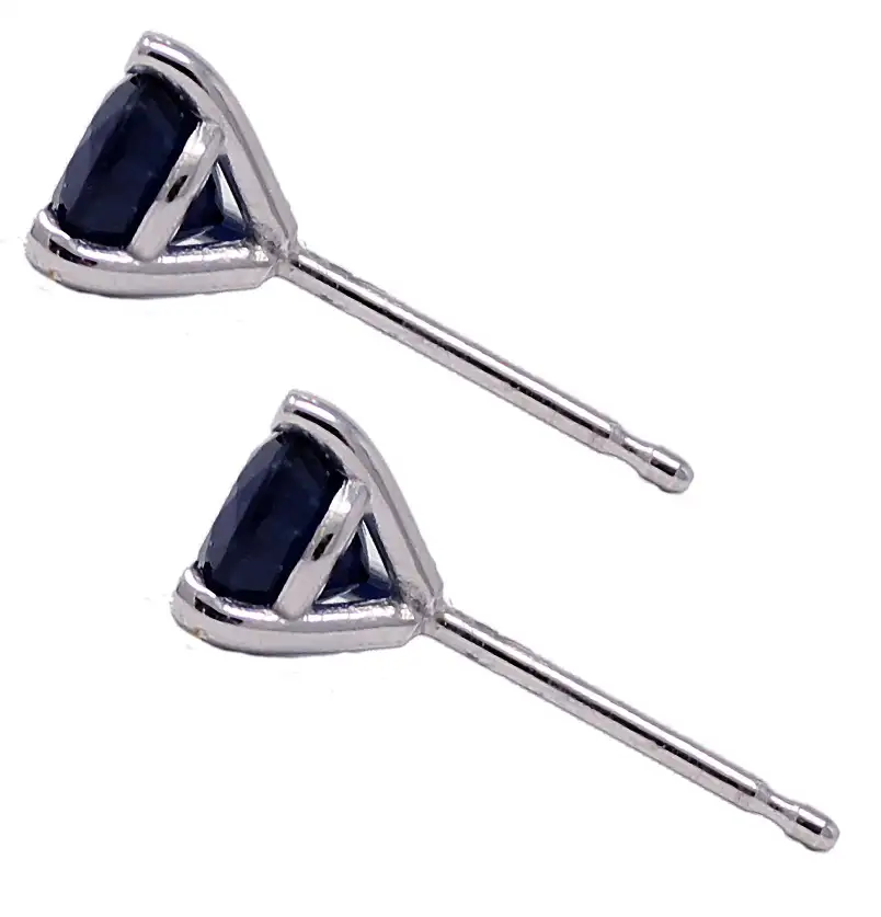 14K white gold round dark blue sapphire post earrings with a martini setting. Total weight of the two round sapphires is 1.15cttw.