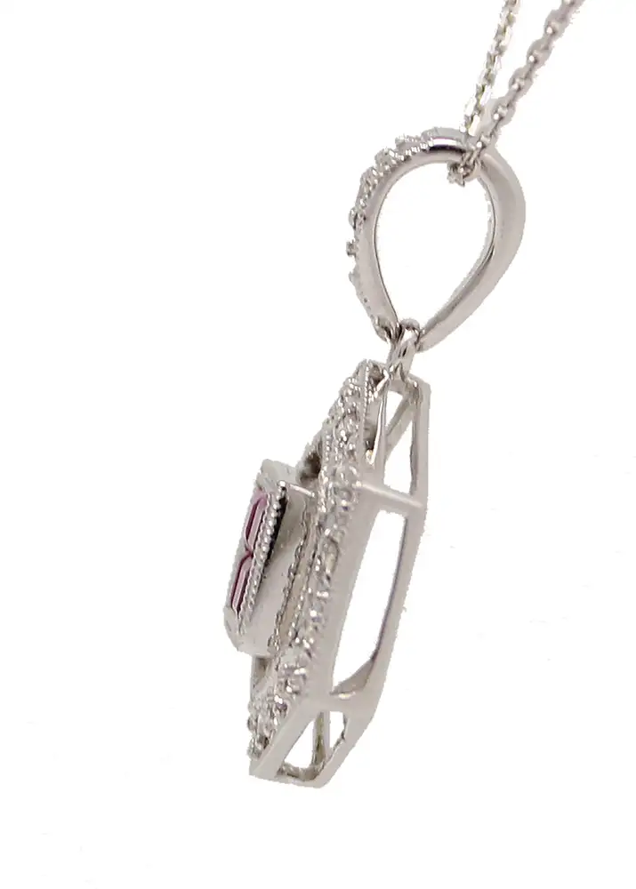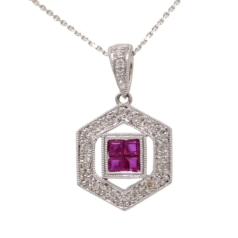 14K white gold ruby and diamond pendant necklace. Four princess cut rubies in the center of the pendant are surround by a hexagon of round diamonds. The rubies weigh 0.25cttw. The chain is 18 inches long.