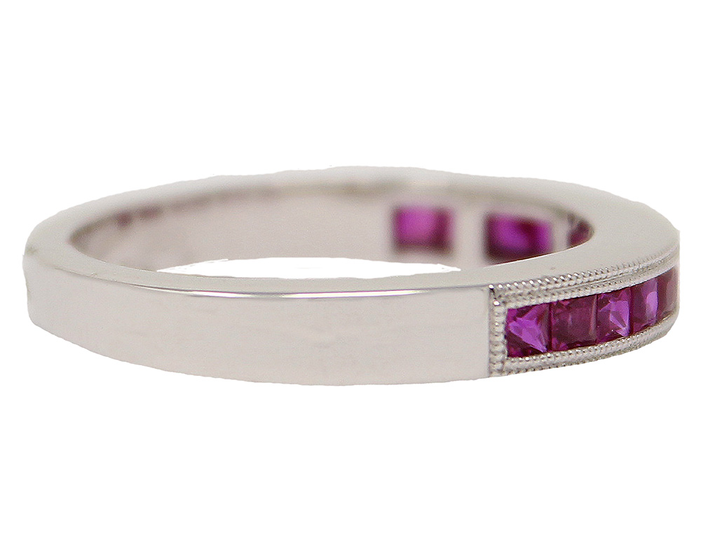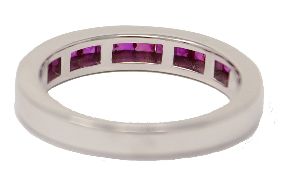14K white gold ruby ring. The emerald cut rubies are channel set and weigh .76cttw. Ring size is 7. Ring can be resized.