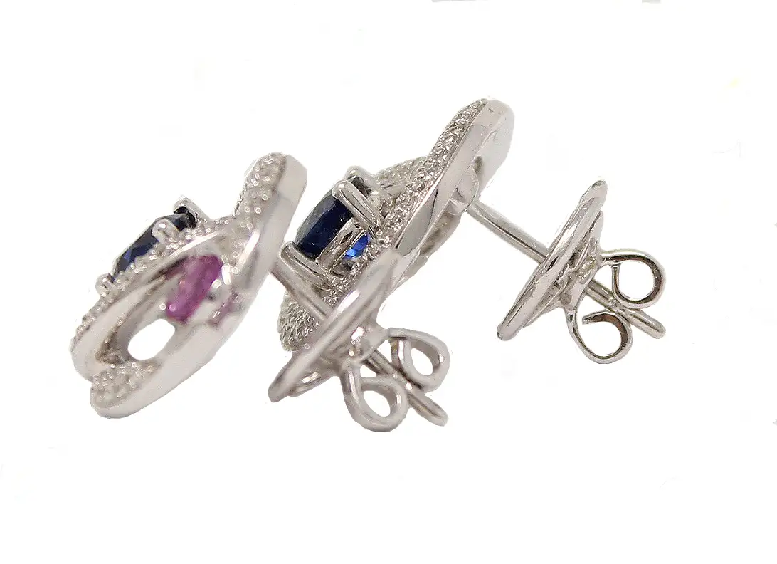 14K white gold sapphire diamond earrings. There is one round blue sapphire and one round pink sapphire in each earring. The two round blue sapphires have a total weight of 1.24cttw. The two round pink sapphires have a total weight of .35cttw. There are 89 individually set round diamonds in each earring for a total of 178 diamonds and a total weight of .45cttw.