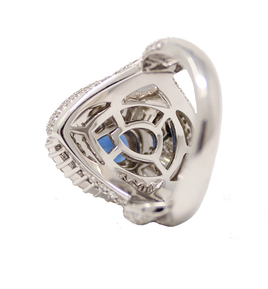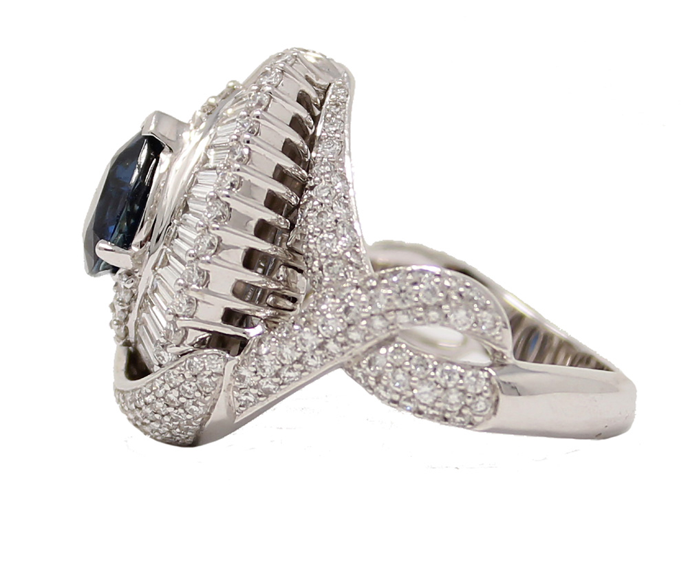 18K white gold sapphire and diamond ring. The center pear-shaped sapphire is 1.85cttw. There are 1.60cttw of individually set round diamonds surrounding the sapphire and accenting the shank. There are 0.82cttw of baguette diamonds surrounding the sapphire.