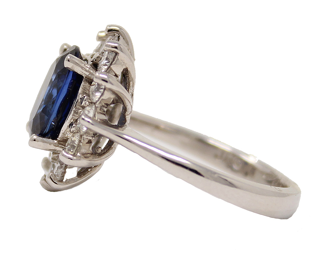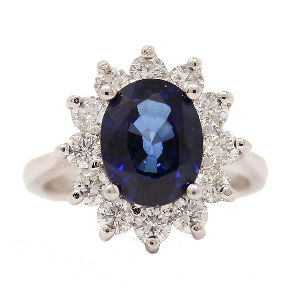 18K white gold oval sapphire and diamond ring. The oval sapphire weight 3.25cttw is surrounded by 12 round diamonds weighing 1.17cttw.