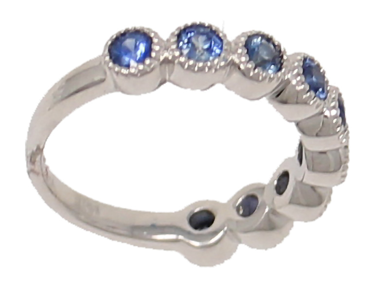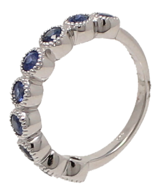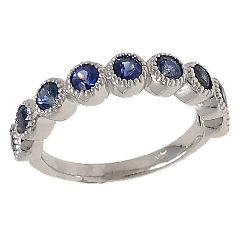 14K white gold sapphire ring with 9 perfectly matched sapphires. The sapphires are set in a decorative bezel and weigh 1.01cttw.