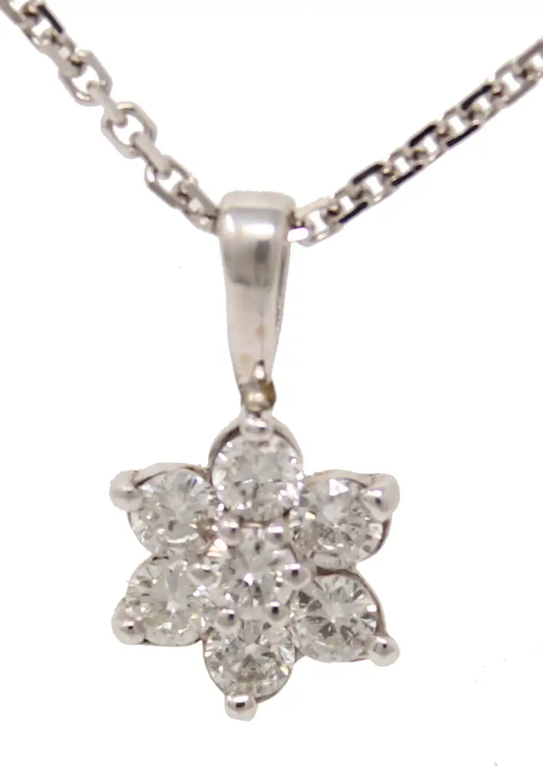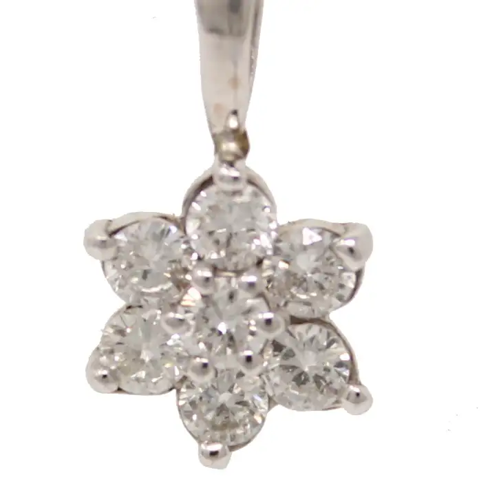 14K white gold 7-diamond pendant necklace. The round diamonds are individually set flush in a flower shaped pendant that is 1/4 inch high by 1/4 inch wide. The total diamond weight is .73cttw. The pendant has an attached bail and hangs from an 16-inch chain.