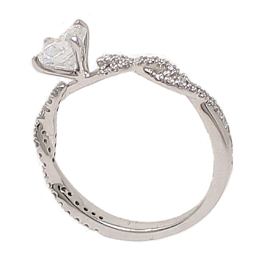 14K white gold semi-mount ready for a 1-carat round center stone. The round diamonds on the twisted shank weigh 0.22cttw. Sized to fit your finger.