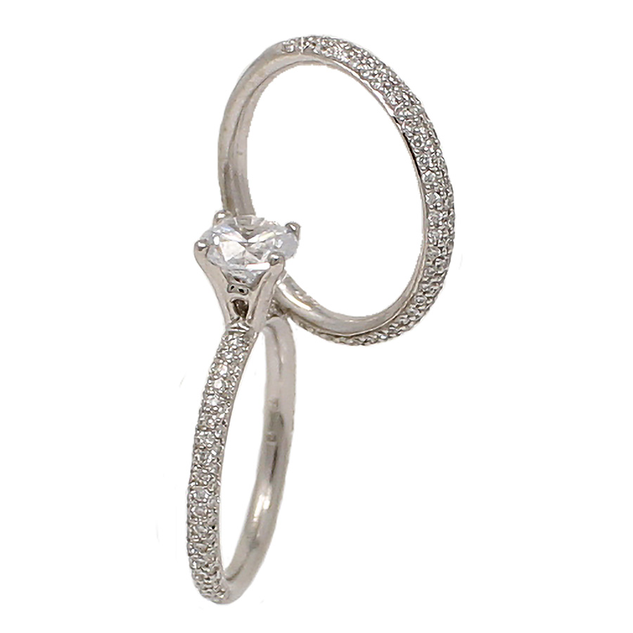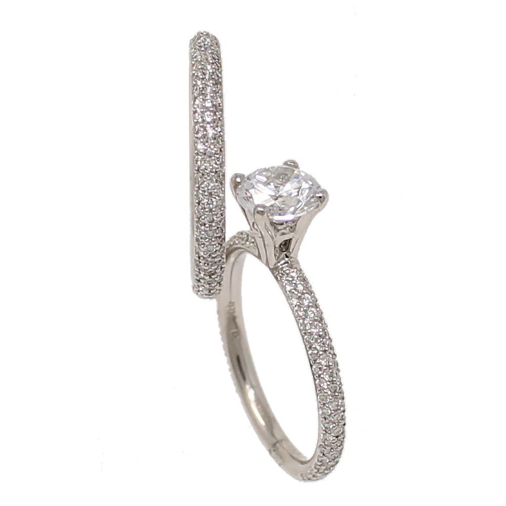 18K white gold semi-mount ready for a 1-carat round center stone with a matching diamond band. The 110 round diamonds on the shank of the ring and on the matching band weigh 1.34cttw. Sized to fit your finger.