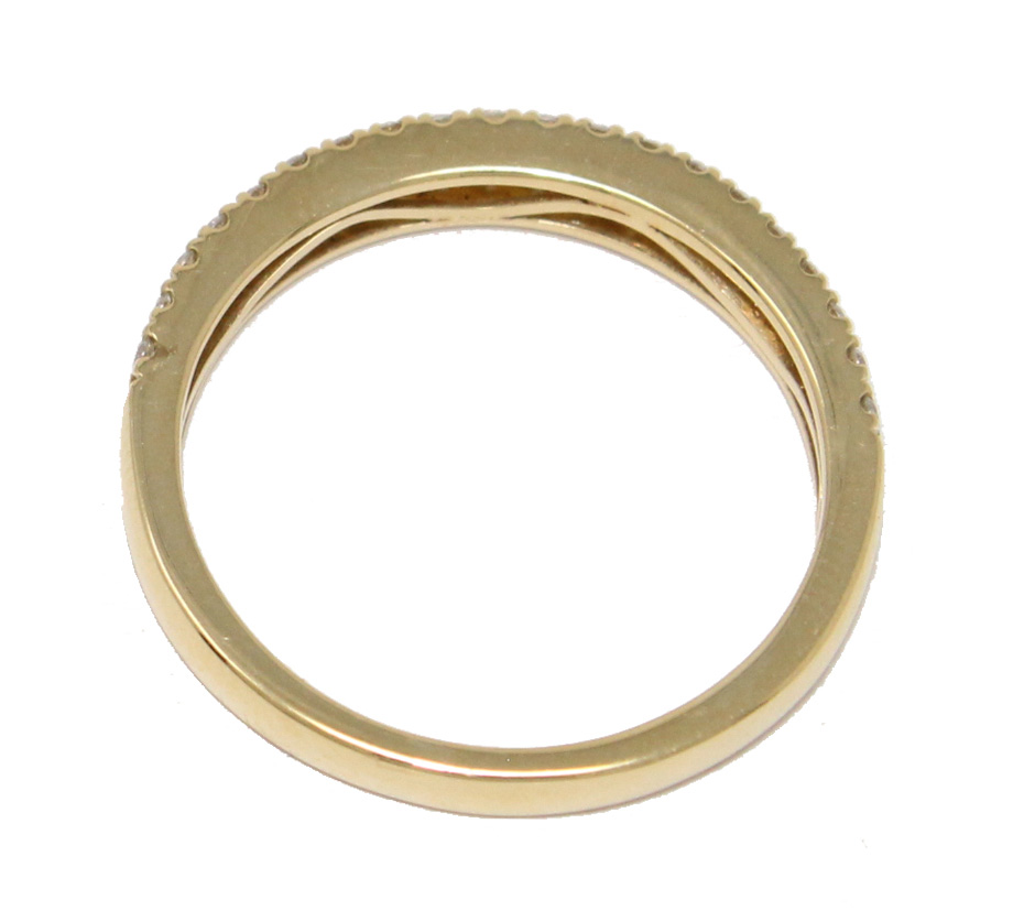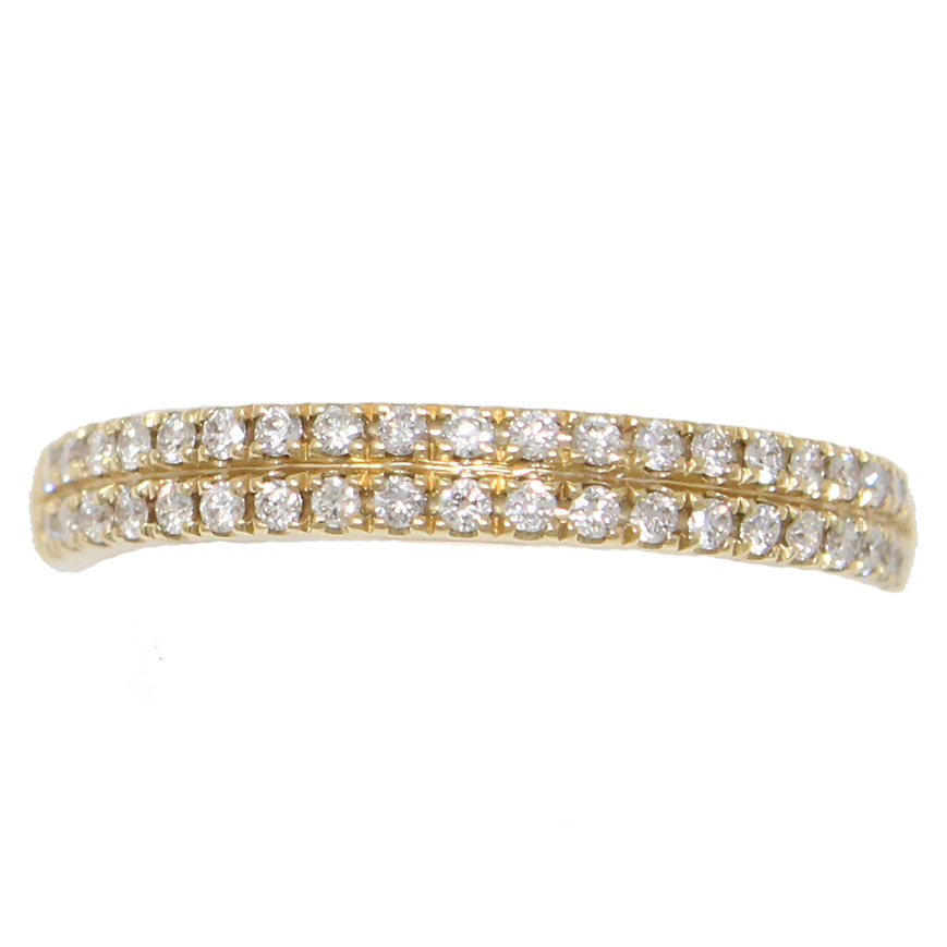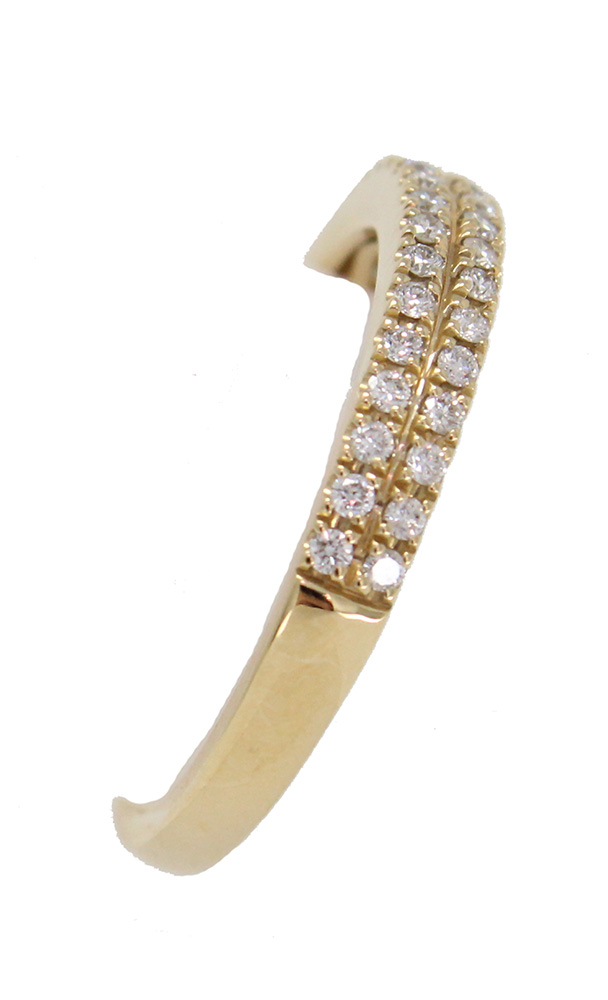 14K yellow gold double band of 40 round diamonds individually set flush in the top half of the ring measures 3.5mm wide. The double band merges into a single band and tapers to 2mm wide in the bottom half of the ring. The total weight of the diamonds is .28cttw. The ring is size 7. It can be resized.