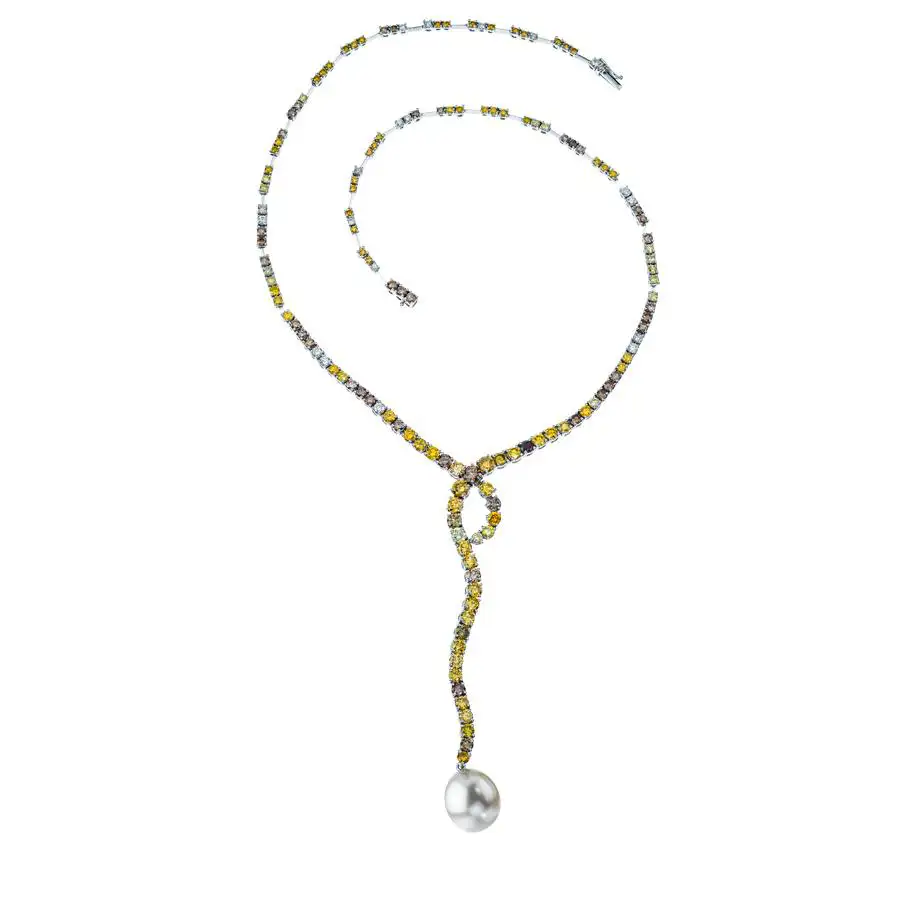 Bergio Couture Crave Necklace: 18K White Gold with Multi-Colored Fancy Diamonds at 11.36 Carat Total Weight & White Pearl Centerpiece at 14.80 Carat Total Weight (B21336-C1)