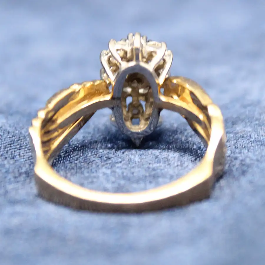 14K yellow and white gold art retro diamond cluster ring. There are 19 round diamonds set in white gold and tiered into a north-south narrow oval. Diamonds have a total weight of 0.40cttw. Clarity SI and I; color J-L.