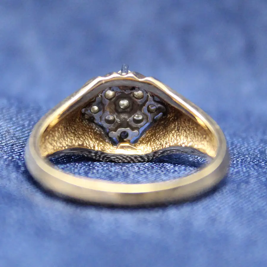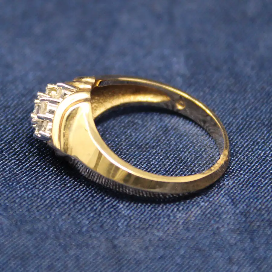 14K yellow gold diamond cluster ring. Nine round diamonds are set in a rotated square. The diamonds are mounded, with the corner diamonds lowest and the center diamond highest.