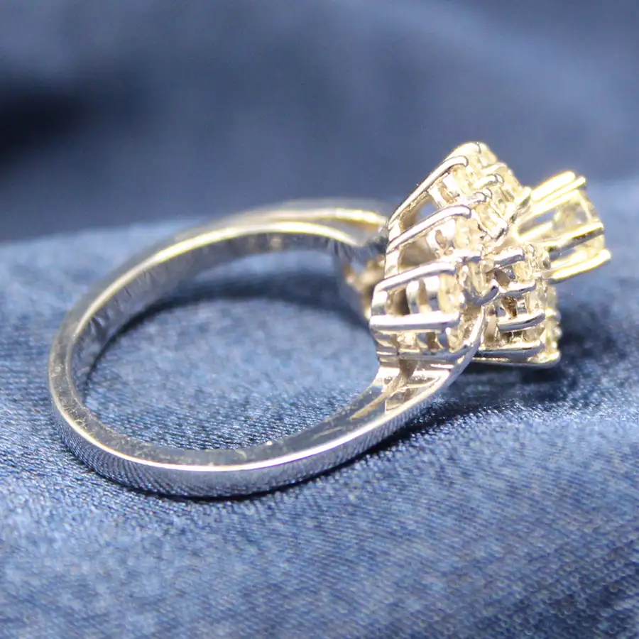There are 30 small round diamonds shaped into two offset east-west arcs on either side of a larger center diamond. The 30 small round diamonds weigh 0.50cttw. Clarity SI; color K-L.