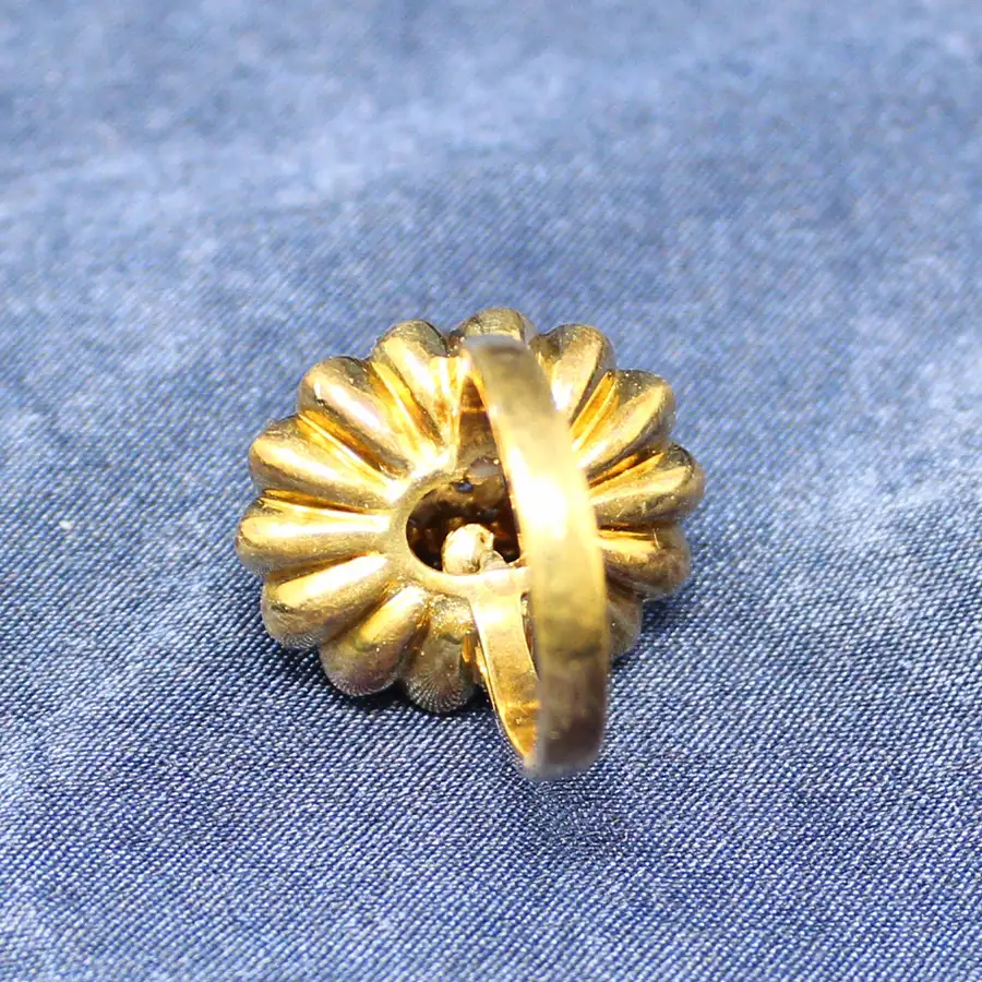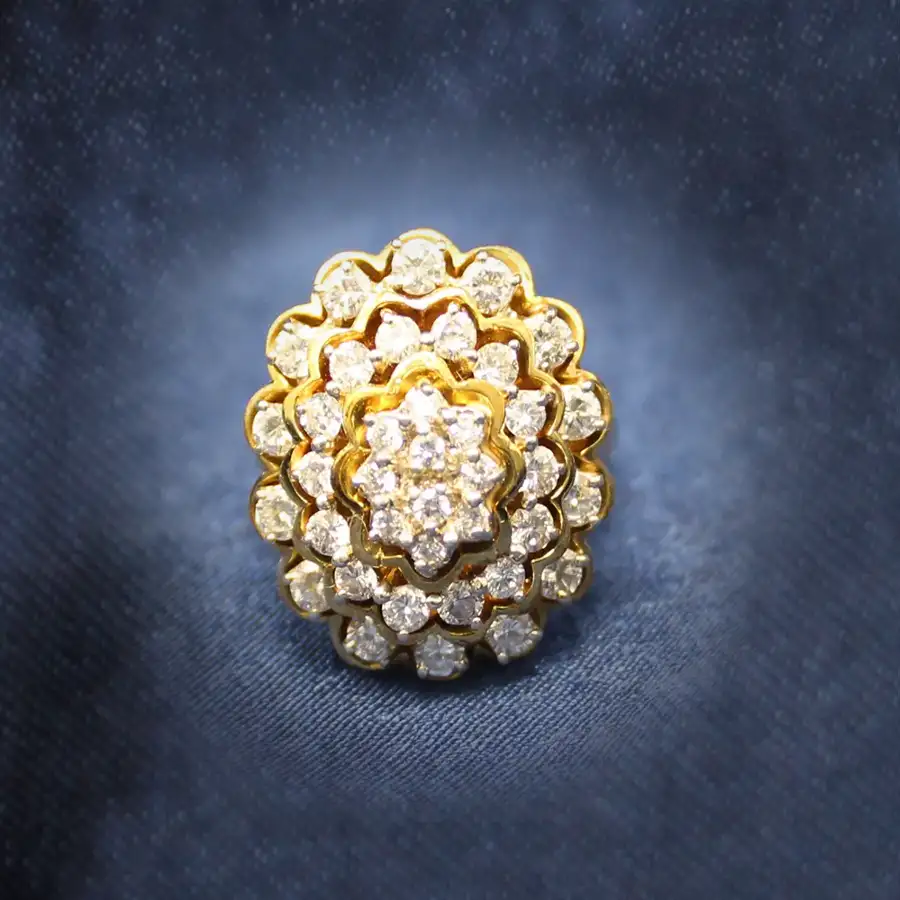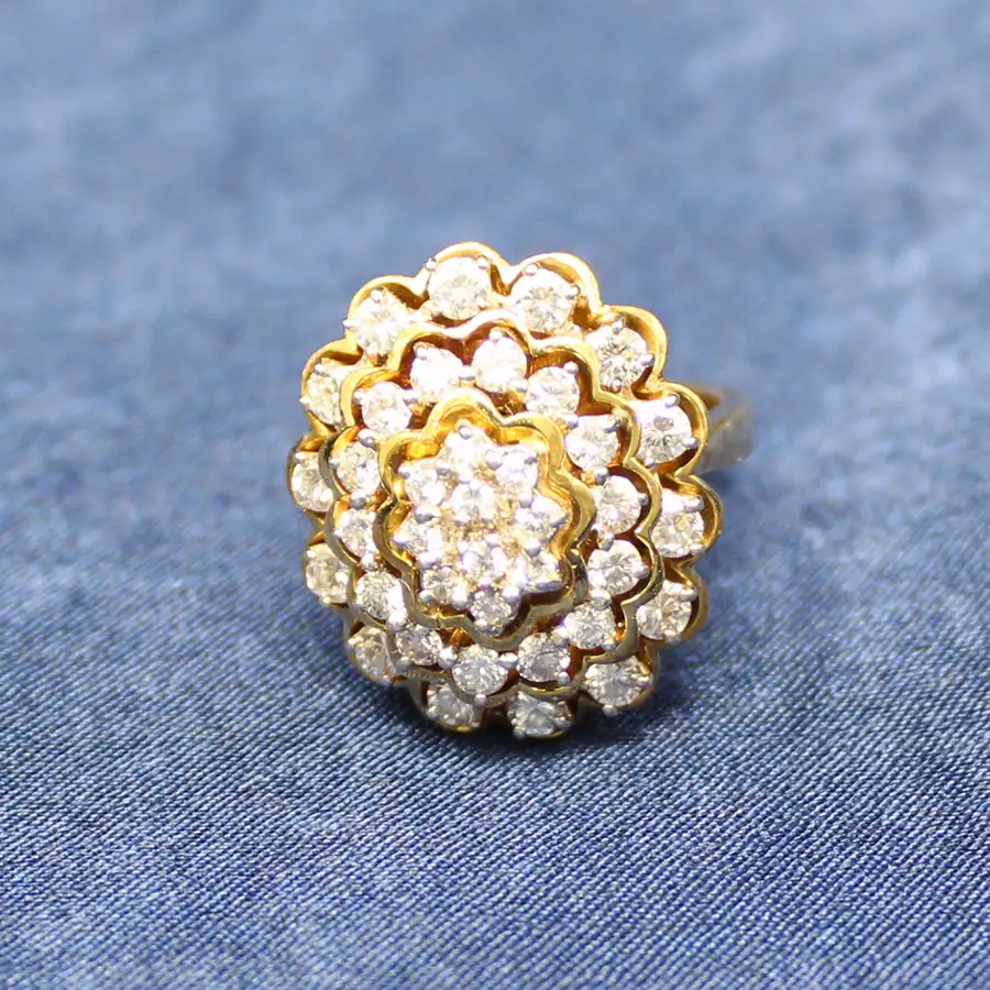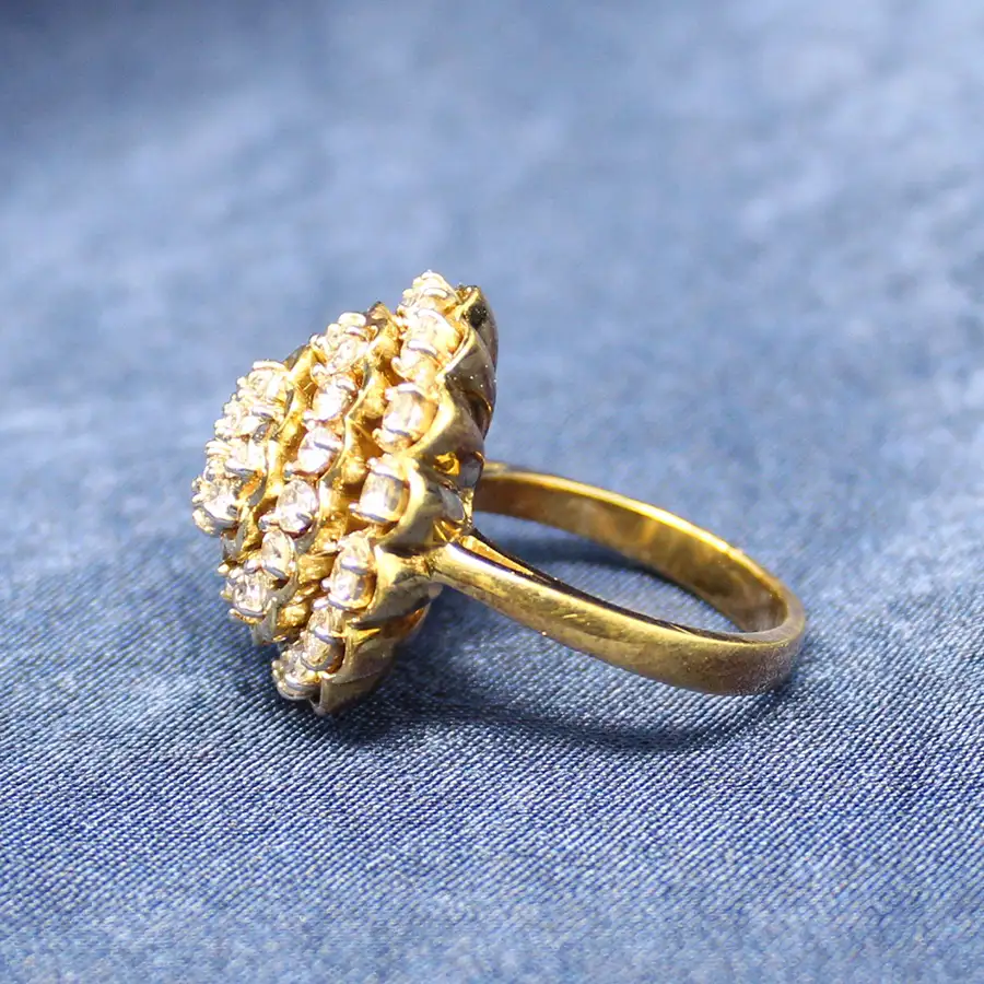 14K yellow gold scalloped tiers of diamonds. The 38 round diamonds are individually set with 14K white gold prongs and arranged in three tiers of yellow gold. Total weight of the 38 diamonds is 1.25cttw. Clarity SI; color JKL